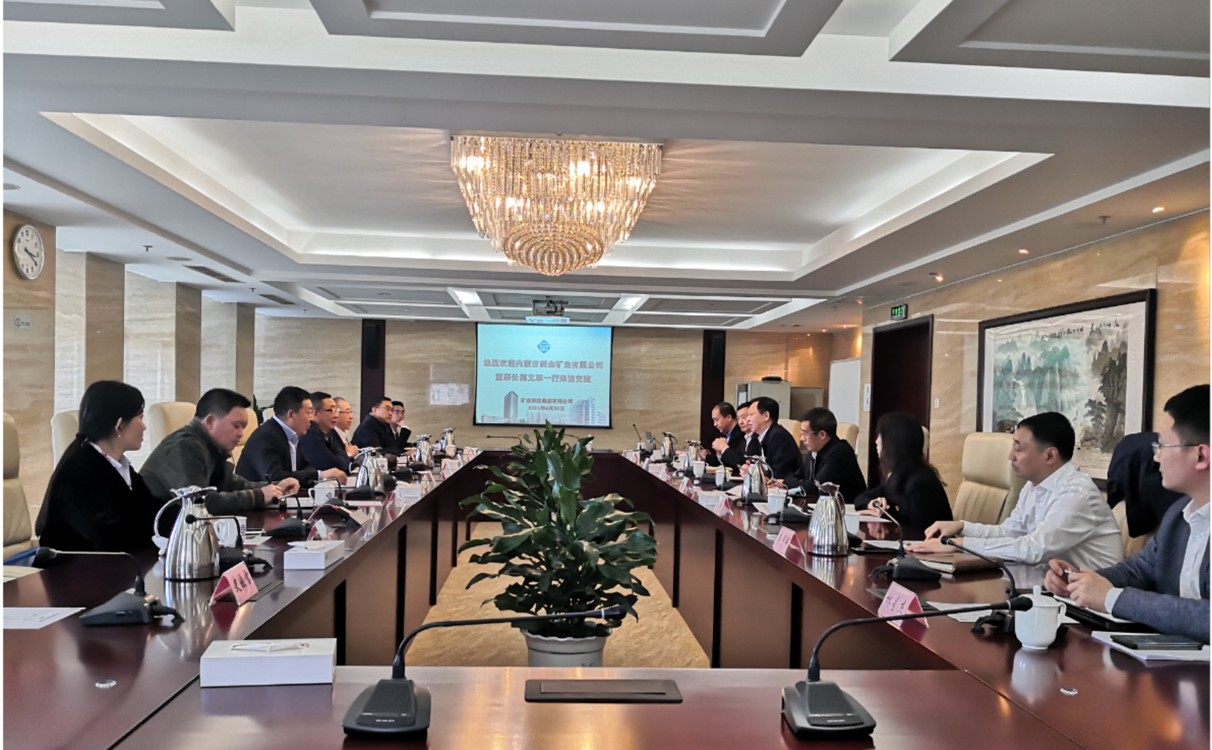 4月30日,集团党委书记、董事长韩龙在集团总部接待内蒙古西金矿业有限公司董事长郭文军一行,双方就进一步加强合作进行座谈交流。集团副总经理马彦卿参加会议。