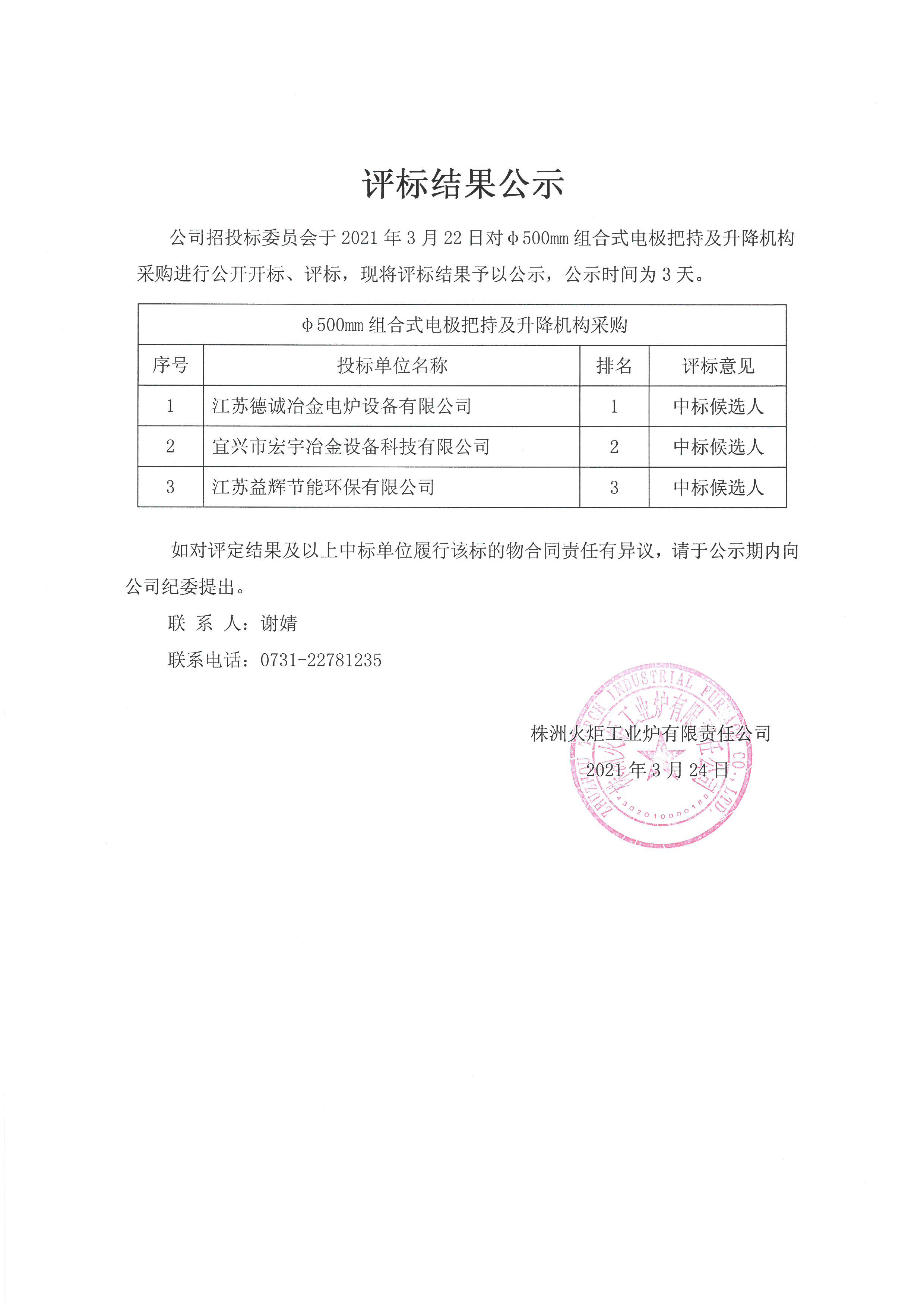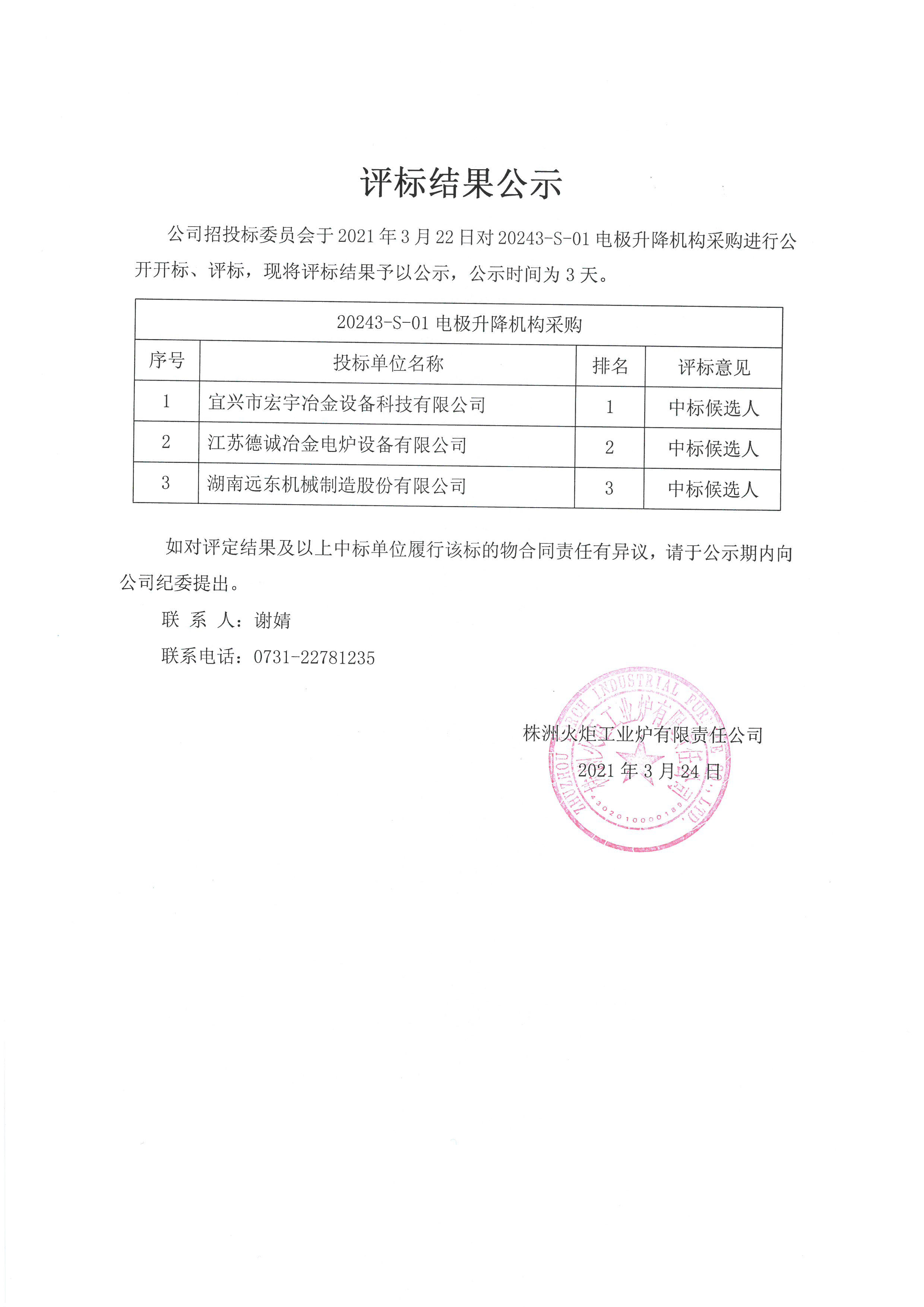【评标结果公示】Φ500mm组合式电极把持及升降机构采购、20243-s-01电极升降机构采购评标结果公示