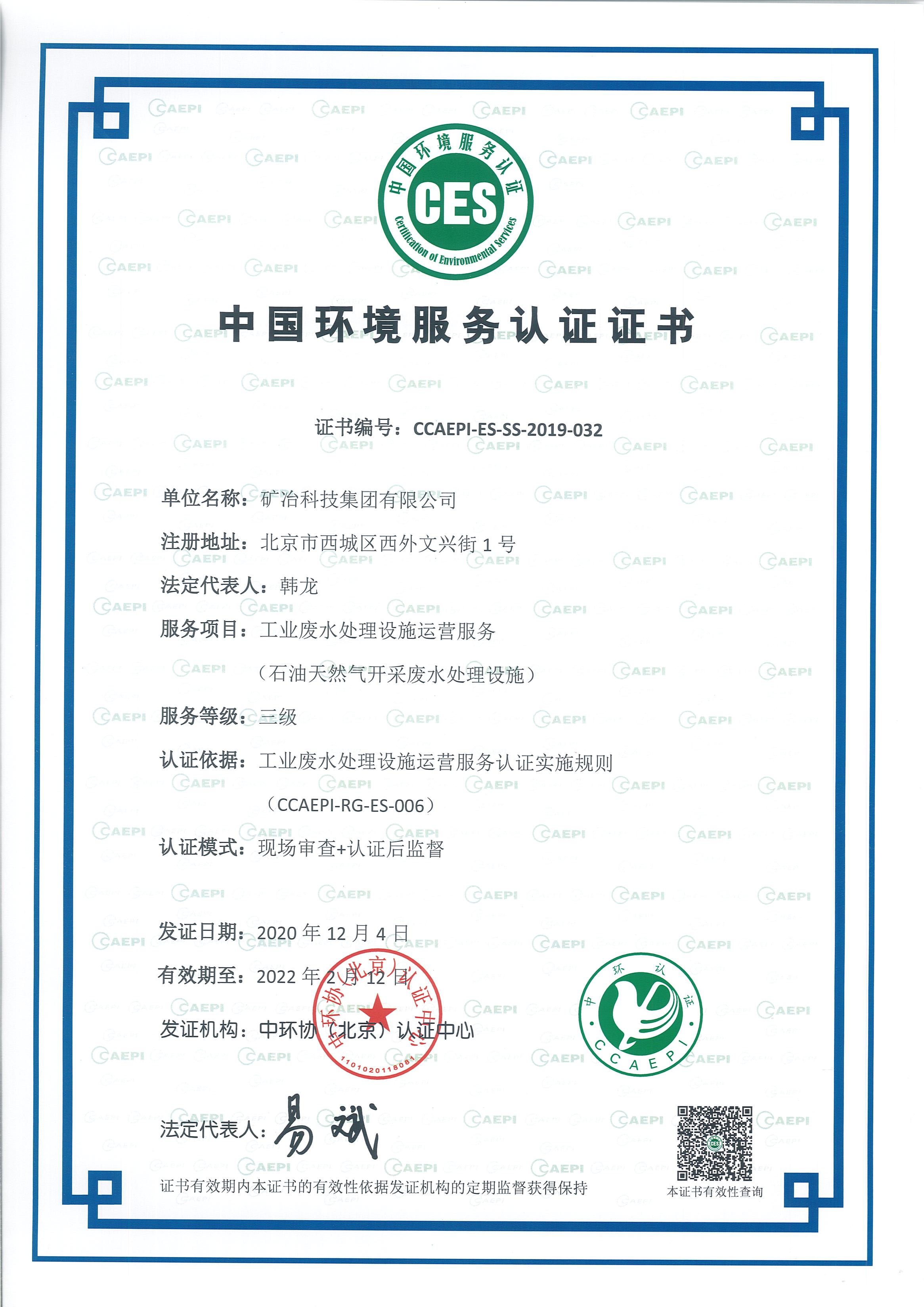 • 中国环境服务认证证书